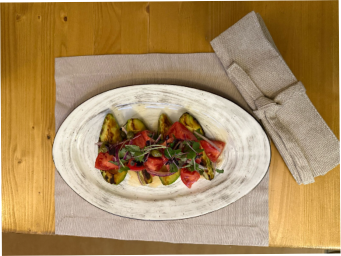Помидор, красный лук, авокадо, каперсы, зеленый базилик, соус цитронет, кресс салат